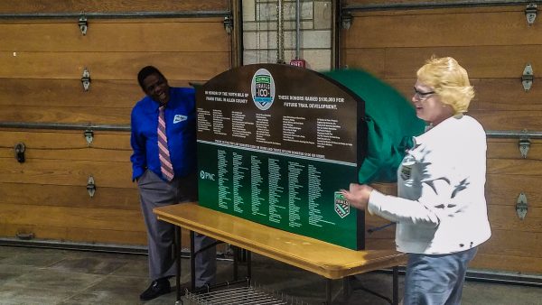 September 27, 2018 – Fort Wayne Trails held a celebration at Shoaff Park’s Conklin Pavilion to recognize all of those individuals who donated to their 100 Mile/ $100K Campaign in early 2018. During the event, Fort Wayne Trails took the opportunity to unveil the sign to recognize those donors, which will be placed at the Towpath Trailhead on Engle Road.