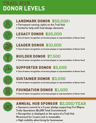 These Trail Hubs not only help fund the development of nearby trail projects, continued maintenance needs, and overall support for Fort Wayne Trails, Inc, but also allow donors to leave a legacy that will benefit trail users for generations.